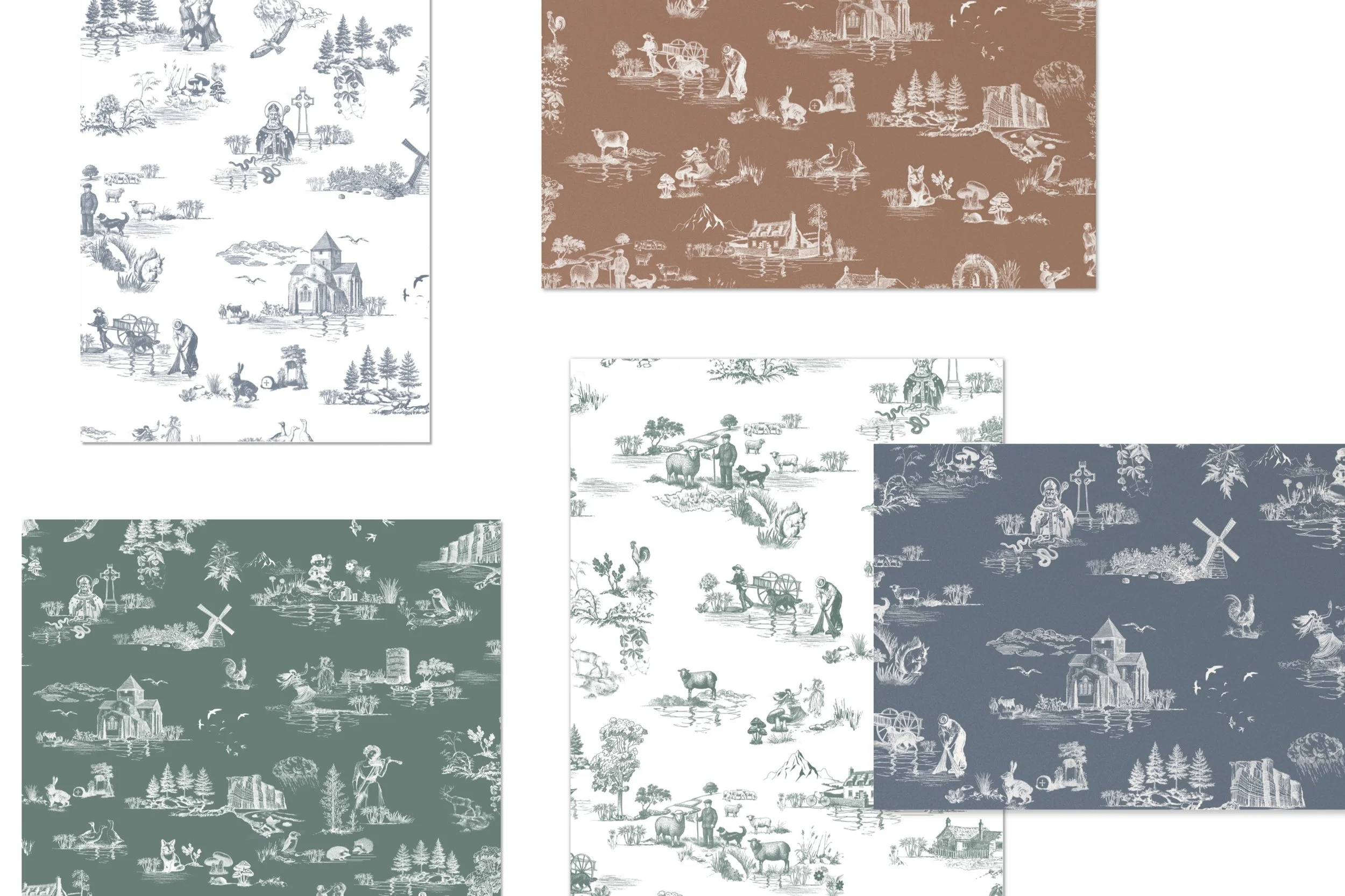 From deep greens to rich blues and earthy browns, the Irish Toile de Jouy pattern comes in six distinctive color options. Whether you're going for a soft neutral aesthetic or a more dramatic, heritage-inspired palette, there’s a version to match your vision. Bonus: instructions are included for customizing the linework or background color in Photoshop.